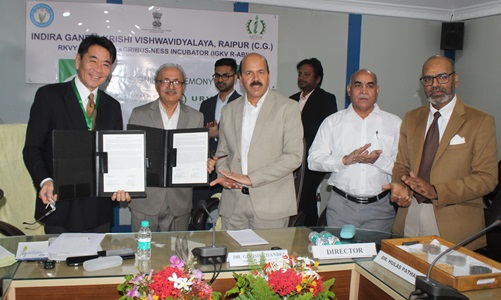 रायपुर। इंदिरा गांधी कृषि विश्वविद्यालय, रायपुर में संचालित एग्री बिजनेस इन्क्यूबेशन सेन्टर, (राबी) के स्टार्टअप ‘‘उर्वरक इंडस्ट्रीज प्राइवेट लिमिटेड’’ एवं ‘‘कोनोइके ग्रुप, जापान’’ के बीच आज यहां एक एम.ओ.यू. हस्ताक्षर समारोह का आयोजन किया गया। इंदिरा गांधी कृषि विश्वविद्यालय के कुलपति डॉ. गिरीश चंदेल की उपस्थिति में उर्वरक इंडस्ट्रीज प्राइवेट लिमिटेड के संस्थापक अनिल पासरी एवं कोनोइके ग्रुप के महाप्रबंधक कात्सुफुमि ओत्सुकी ने एम.ओ.यू. में हस्ताक्षर किये। इस अवसर पर कोनोइके ग्रुप सीनियर बिजनेस डेवलपमेंट मैनेजर हीरोशी सोएजिमा, कार्यकारी अधिकारी तोशिहिरो फुजिवारा और उनकी टीम सहित इंदिरा गांधी कृषि विश्वविद्यालय के संचालक एवं निदेशकगण तथा कृषि महाविद्यालय, रायपुर के अधिष्ठाता एवं एग्री बिजनेस इन्क्यूबेशन सेन्टर के मुख्य कार्यपालन अधिकारी डॉ. हुलास पाठक एवं उद्योगपति उपस्थित थे।
