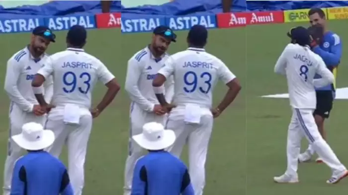 कानपुर: ग्रीन पार्क स्टेडियम में भारत और बांग्लादेश के बीच दूसरे टेस्ट मैच की शुरुआत हो चुकी है। मुकाबले में टीम इंडिया के कप्तान रोहित शर्मा ने टॉस जीतने के बाद पहले गेंदबाजी का फैसला किया। बारिश के कारण मैच की शुरुआत देर से हुई। इस दौरान जब भारतीय फील्डर मैदान पर उतरे तो एक बहुत ही मजेदार नजारा देखने को मिला। दरअसल विराट कोहली और रविंद्र जडेजा मिलकर अपने साथी खिलाड़ी जसप्रीत बुमराह के साथ मजाक कर रहे थे।