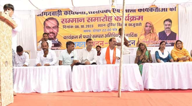 आज राजनगर विधानसभा के खजुराहो टूरिस्ट विलेज में आंगनवाड़ी कार्यकर्ता , सहायिका एवं आशा कार्यकर्ताओं , मातृशक्तिओं का सम्मान समारोह कार्यक्रम संपन्न हुआ ! खजुराहो में पर्यटन नगरी खजुराहो में टूरिस्ट विलेज में मातृशक्तिओं का सम्मान समारोह का आयोजन किया गया जिसमें बढ़-चढ़कर महिलाओं ने कार्यक्रम में हिस्सा लिया और महिलाओं द्वारा राजनगर विधानसभा से भाजपा उम्मीदवार अरविंद पटेरिया जी का तहे दिल से शुक्रिया एवं समर्थन देने की बात कही गई साथ ही साथ कार्यक्रम में राजनगर अध्यक्ष जीतू वर्मा खजुराहो अध्यक्ष पप्पू अवस्थी के साथ सभी कार्यकर्ताओं ने आई हुई महिलाओं का स्वागत सत्कार किया