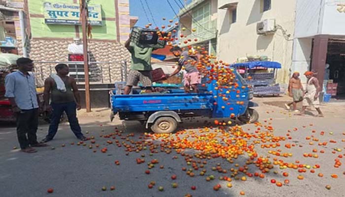 जिले की शहर नगर पंचायत रामानुजगंज में दो महीने पहले टमाटर का रेट ढाई सौ से तीन सौ रुपय किलो तक पहुंच गया था। वहीं, पिछले कुछ दिनों से लगातार टमाटर के रेट में गिरावट आ रही थी। आज स्थिति ऐसी हो गई कि रामानुजगंज के थोक सब्जी बाजार में टमाटर का थोक रेट तीन रुपये किलो हो गया है। किसानों ने इससे हताश और निराश होकर टमाटर को बीच बाजार में फेंक दिया।