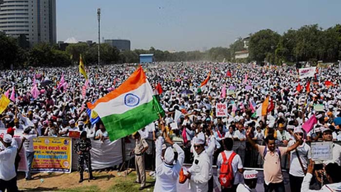पुरानी पेंशन स्कीम बहाली को लेकर देशभर के कर्मियों ने दिल्ली में हुंकार भरी। रामलीला मैदान आयोजित महारैली में बड़ी संख्या में केंद्र और राज्य सरकार के कर्मचारी पहुंचे जिनके समर्थन में कई पार्टियों के नेता, किसान नेता समेत कई संगठन के कार्यकर्ता मौजूद थे। उनका कहना था कि सरकार अपनी जिद नहीं छोड़ती है तो इससे भी बड़ा आंदोलन पूरे देश में किया जाएगा। अगामी लोकसभा चुनाव में केंद्र व राज्य सरकार के 10 करोड़ कर्मियों की यह संख्या निर्णायक साबित होगी।