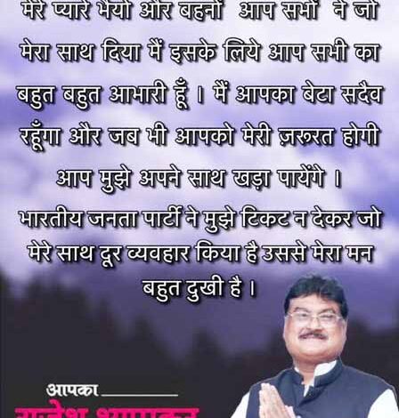 उन्होंने अपने संदेश में लिखा है कि इससे उनका मन काफी दुखी है। श्यामकर भाजपा समर्थित जिला पंचायत सदस्य हैं और डोंगरगढ़ विधानसभा से टिकट के लिए जोर लगा रहे थे। पार्टी ने उनकी जगह पूर्व विधायक विनोद खांडेकर को बेहतर प्रत्याशी मानते मैदान में उतार दिया है। श्यामकर ने क्षेत्र की जनता से यह भी कहा है कि जरूरत पड?े पर वह हमेशा साथ होंग बहरहाल श्यामकर का संदेश सोशल मीडिया में खूब वायरल हो रहा है।