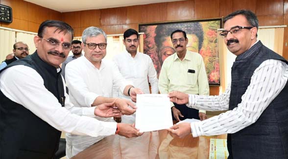 भारतीय जनता पार्टी के प्रदेश अध्यक्ष व सांसद विष्णुदत्त शर्मा और केंद्रीय मंत्री व प्रदेश चुनाव सह प्रभारी अश्विनी वैष्णव पार्टी पदाधिकारियों के साथ सोमवार को निर्वाचन कार्यालय पहुंचे और मुख्य निर्वाचन पदाधिकारी को इस संबंध में ज्ञापन सौंपा।